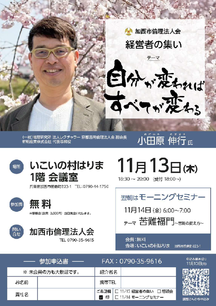 2025/11/13(木)18:30~20:00 加西市倫理法人会 経営者の集いを開催します。